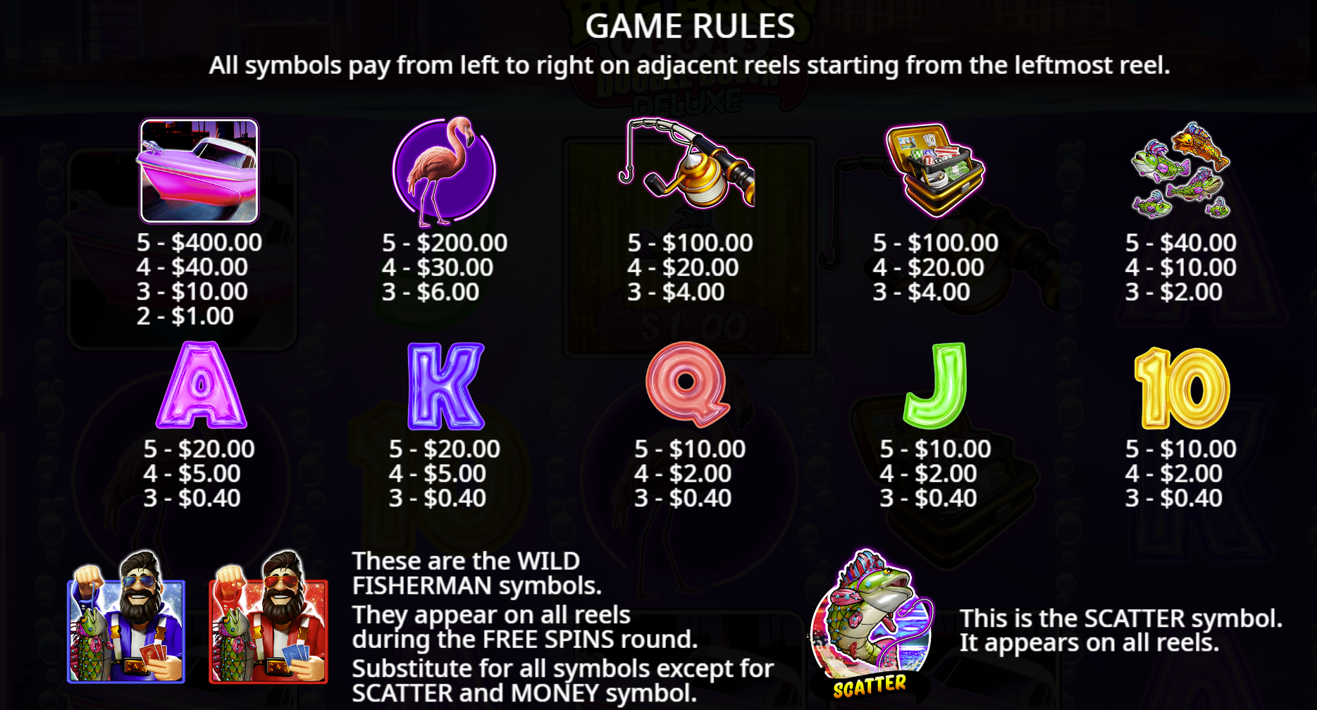 In the base game and free spins, the fisherman wild can appear in two ways: Standard Wild: Collects the values of all money fish on the screen and awards +1 extra free spin (in the bonus round). Double Down Wild: This special version does everything the standard wild does, but then DOUBLES the total collected amount before awarding it. This single feature can instantly create a monster win.